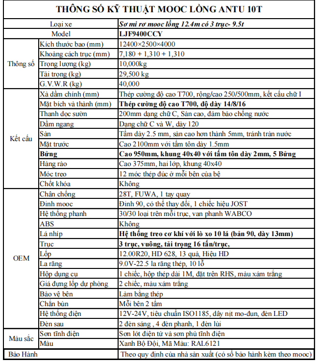 Mooc lồng ANTU 12.4m – Xác 10T – Chuyên tải nặng: Khung thép T700, sàn thép 2.5 mm, bửng cao 950 mm, 3 trục 16T, lốp 12.00R20 HD, hệ phanh WABCO. Thiết kế linh hoạt, vận chuyển đa dạng hàng hóa. Có sẵn tại Tổng kho Mooc Hải Âu – Hotline: 0905 590 950.