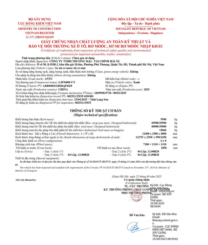 | Kích thước tổng thể | 12.400 × 2.500 × 4.000 mm |